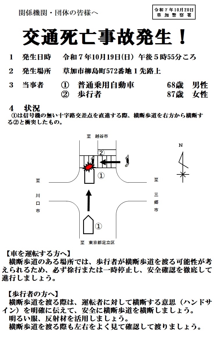 令和7年10月19日(日曜日)午後5時55分ころ、埼玉県草加市柳島町572番地1先路上(県道吉場安行東京線)において、乗用車が東京都足立区方面から信号機が設置されていない交差点を越谷市方面に直進する際、横断歩道を右から左に横断中の歩行者と衝突し、歩行者の高齢女性が死亡する事故が発生しました。