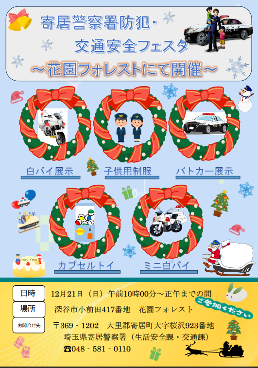 令和7年12月21日(日曜日)午前10時から正午までの間、深谷市小前田所在の「花園フォレスト」において、寄居警察署「防犯・交通安全フェスタ」を開催致します。