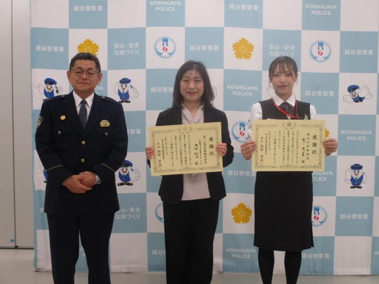 令和8年2月12日(木曜日)、特殊詐欺未然防止功労者である越谷大里郵便局及び第一生命保険株式会社北越谷営業オフィスの職員に対し、越谷警察署長より感謝状を贈呈しました。